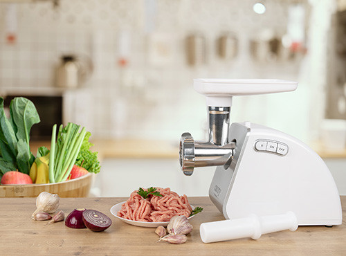 Тверде пристрій для тих, хто хоче готувати власні ковбаси і фарш. Більша, ніж стандартна помольна камера № 8 дозволяє перемелювати 2 кг м'яса за хвилину. М'ясорубка оснащена 3 змінними ситами з нержавіючої сталі з отворами діаметром 3 мм, 5 мм, 7 мм. Також в комплекті є ковбасна насадка, Kebbe насадка і штовхач. Все буде зроблено з міцних матеріалів, які легко розібрати і очистити. У користувача є вибір з 2 передач (вперед і назад - назад). Машина має потужність 500 Вт з передавальним відношенням до 1600 Вт. Пристрій має вбудований відсік для навісного обладнання та сітчастих фільтрів для запобігання їх втрати. Машина оснащена двостороннім ножем Phillips, термін служби якого довше, а установка простіше, оскільки з обох сторін ріжеться. Таким чином, немає ризику зворотного складання поперечного різака, і, отже, необхідно розібрати бритву, щоб перенести її на ріжучу бік, як у випадку односторонніх ножів.