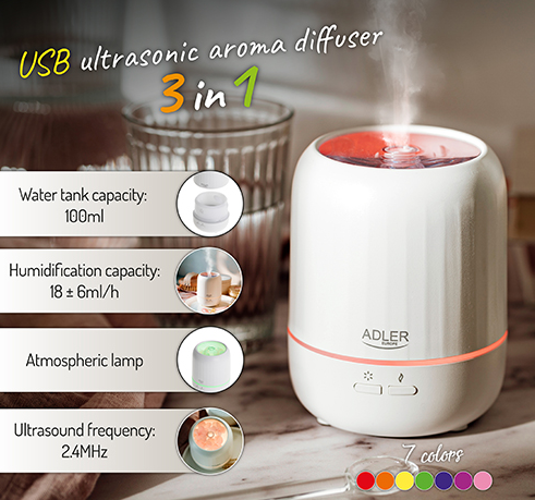 Ультразвуковий USB-дифузор 3-в-1 ADLER AD 7968 забезпечує швидкий і ефективний розподіл аромату, що переноситься подрібненими частинками води, змішаними з ефірною олією. Ультразвуковий аромадифузор USB 3 в 1 - це чудова альтернатива старим моделям такого типу пристроїв і ароматичних свічок, якими можуть користуватися не всі.
